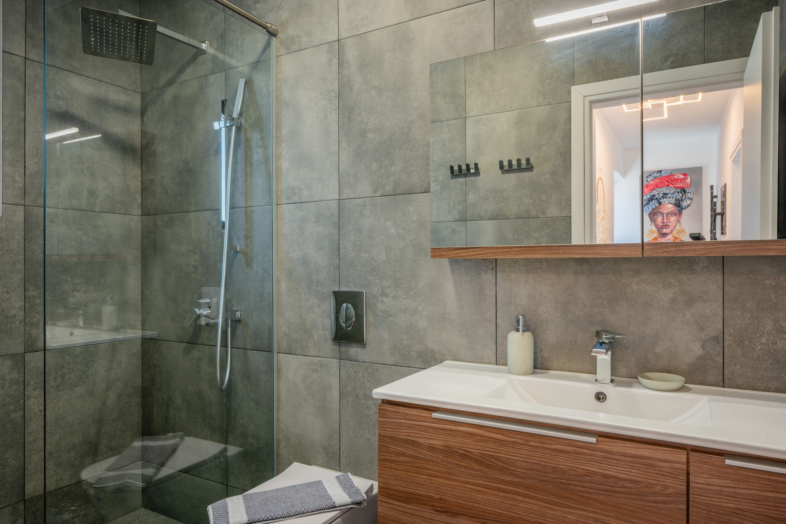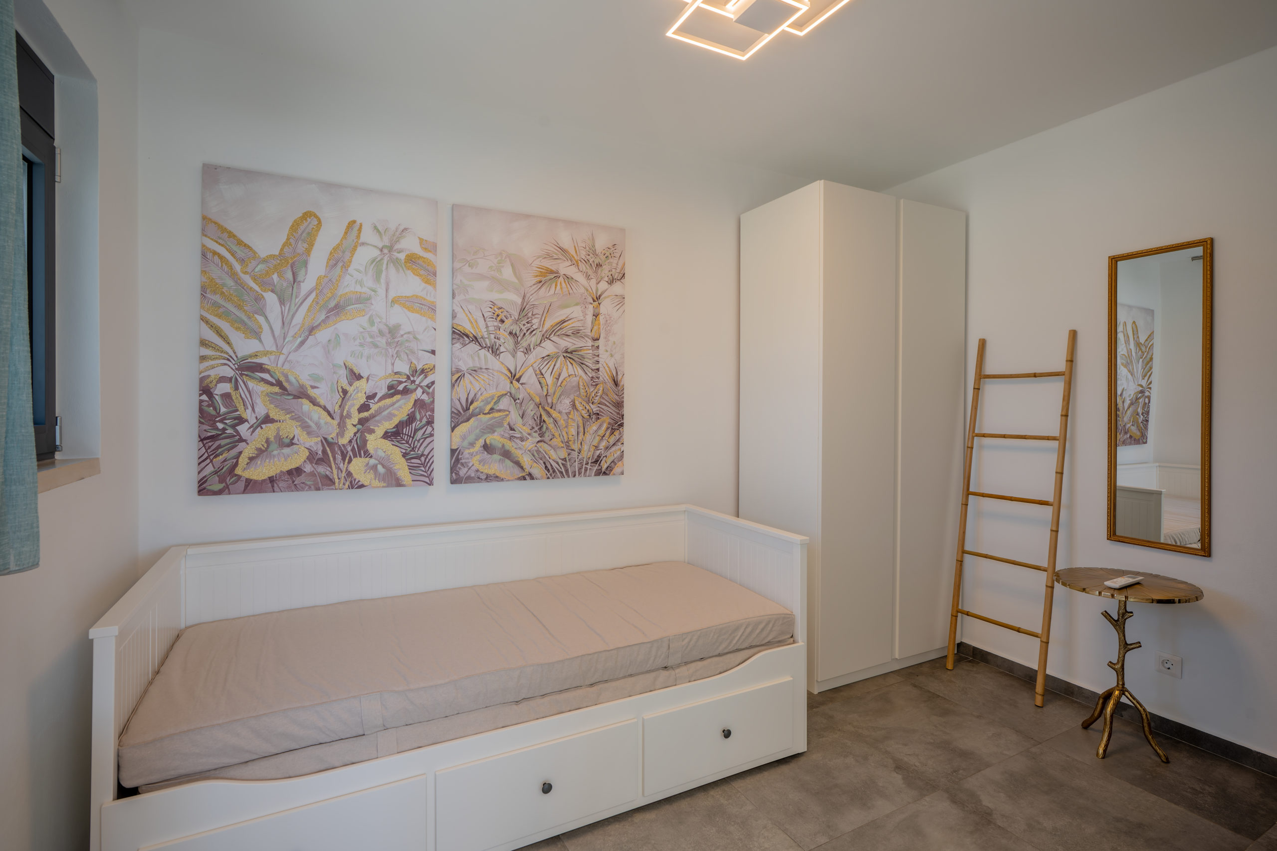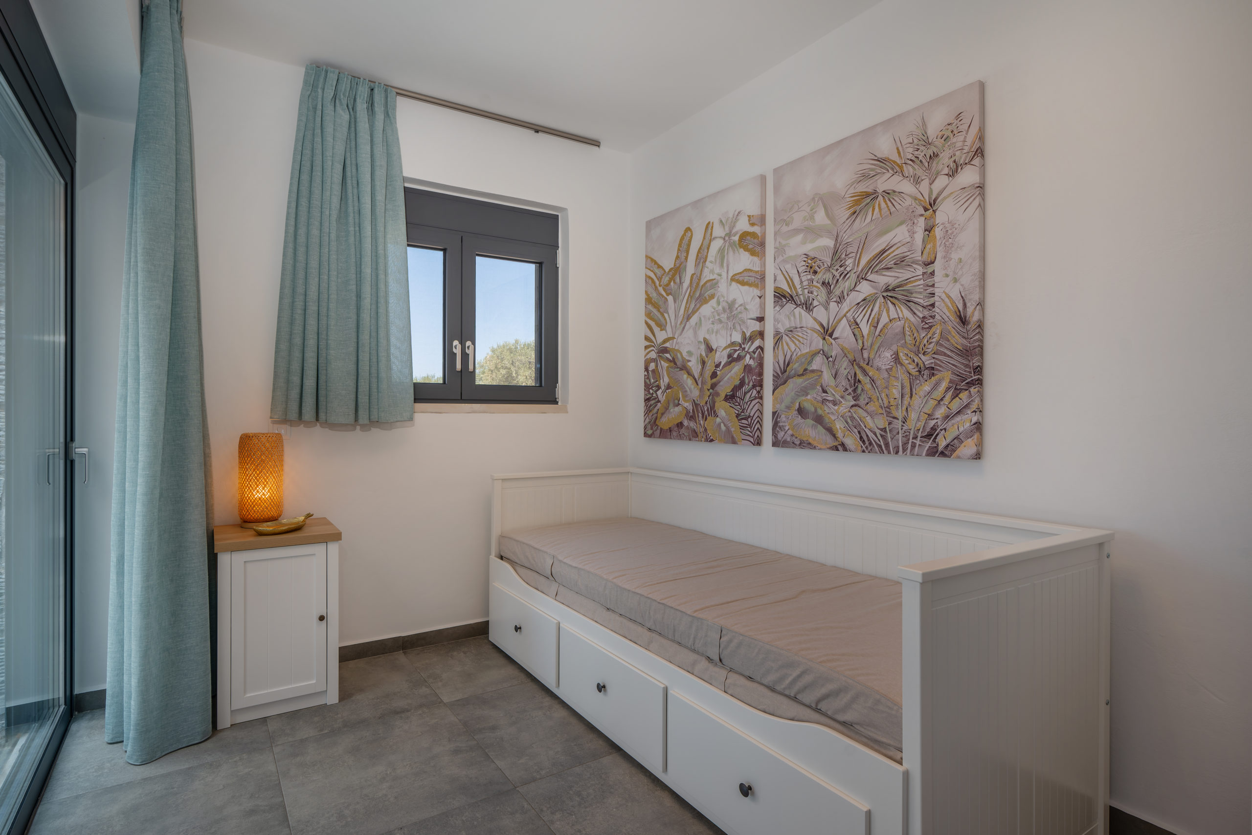 Der zweite Teil des Hauses beinhaltet 2 weitere Schlafzimmer mit einem Bad. Vor jedem der fünf Schlafzimmer befindet sich eine kleine Terrasse mit einem Tischchen und 2 Stühlen, um einen kleinen Rückzugsort zu schaffen. Die Ausstattung des Bades ist identisch mit den anderen Bädern.